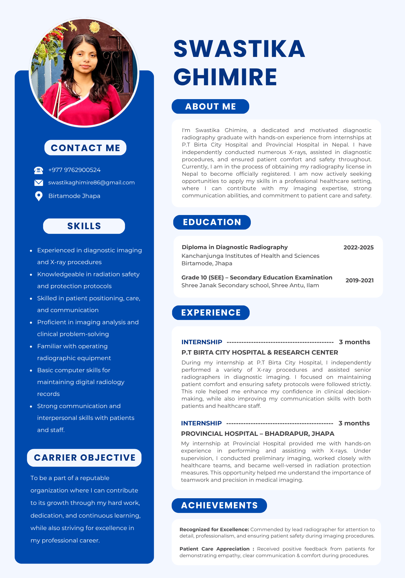 "Swastika Ghimire is an exceptional radiographer whose expertise in conducting X-rays of various human body parts is truly recommendable. With precision and care, Swastika ensures accurate imaging, aiding in the diagnosis and treatment of patients. Her dedication to their craft shines through in every scan, instilling confidence in both patients and colleagues. I highly recommend Swastika for their professionalism, skill, and commitment to quality healthcare."